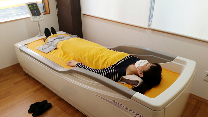 ベットに寝た状態で内蔵された4つのノズルから放出される水圧で全身の筋肉を緩める治療器です。仰向けで受けることが出来るので、うつ伏せでの圧迫が苦手な方や体力の弱いお年寄りの方でも安全にマッサージを受けることができます。